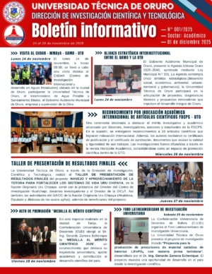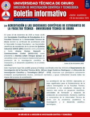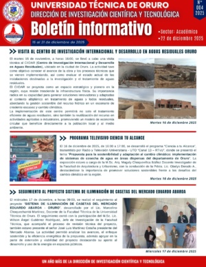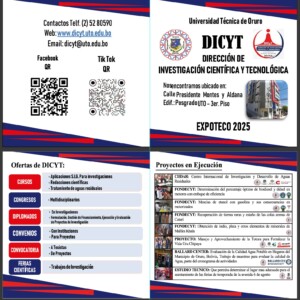 La DIRECCIÓN DE INVESTIGACIÓN CIENTÍFICA Y TECNOLÓGICA (DICYT) esta presente en la expoteco ORURO 2025, En nuestro stand número 47, ubicado en el Bloque Pariguana. Invitamos a toda la comunidad universitaria y al público en general a visitarnos, conocer más sobre nuestras líneas de investigación presentando información sobre el CIIDAR (CENTRO INTERNACIONAL DE INVESTIGACIÓN Y DESARROLLO EN AGUAS RESIDUALES), un proyecto emblemático que busca convertirse en un referente nacional e internacional en el tratamiento y saneamiento de aguas residuales que impulsa el desarrollo científico y tecnológico. Además, tenemos juegos, material informativo y premios, promoviendo así la ciencia y el conocimiento.