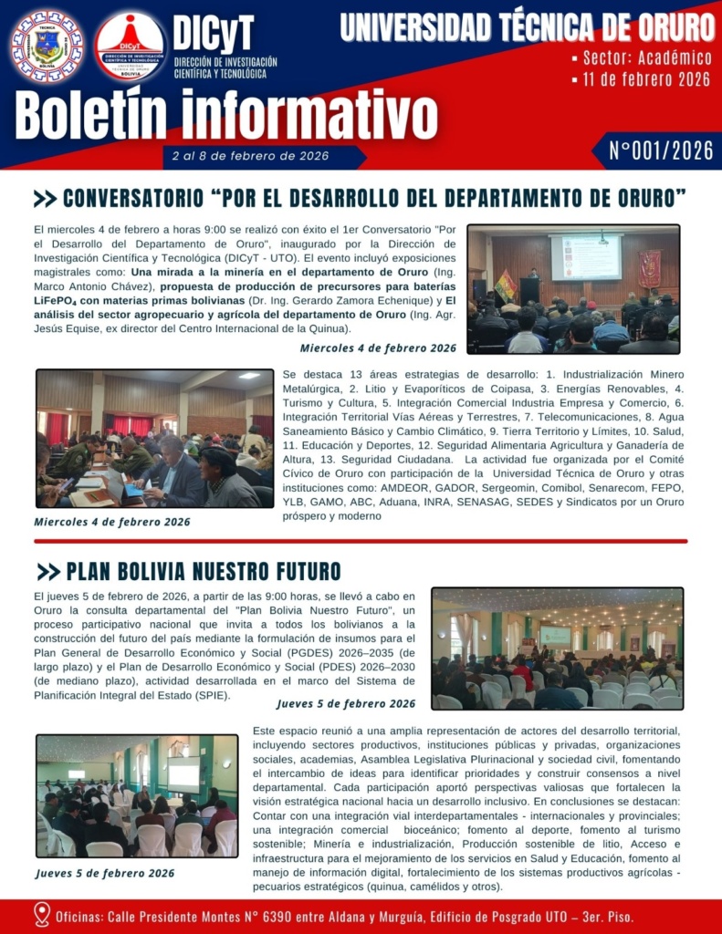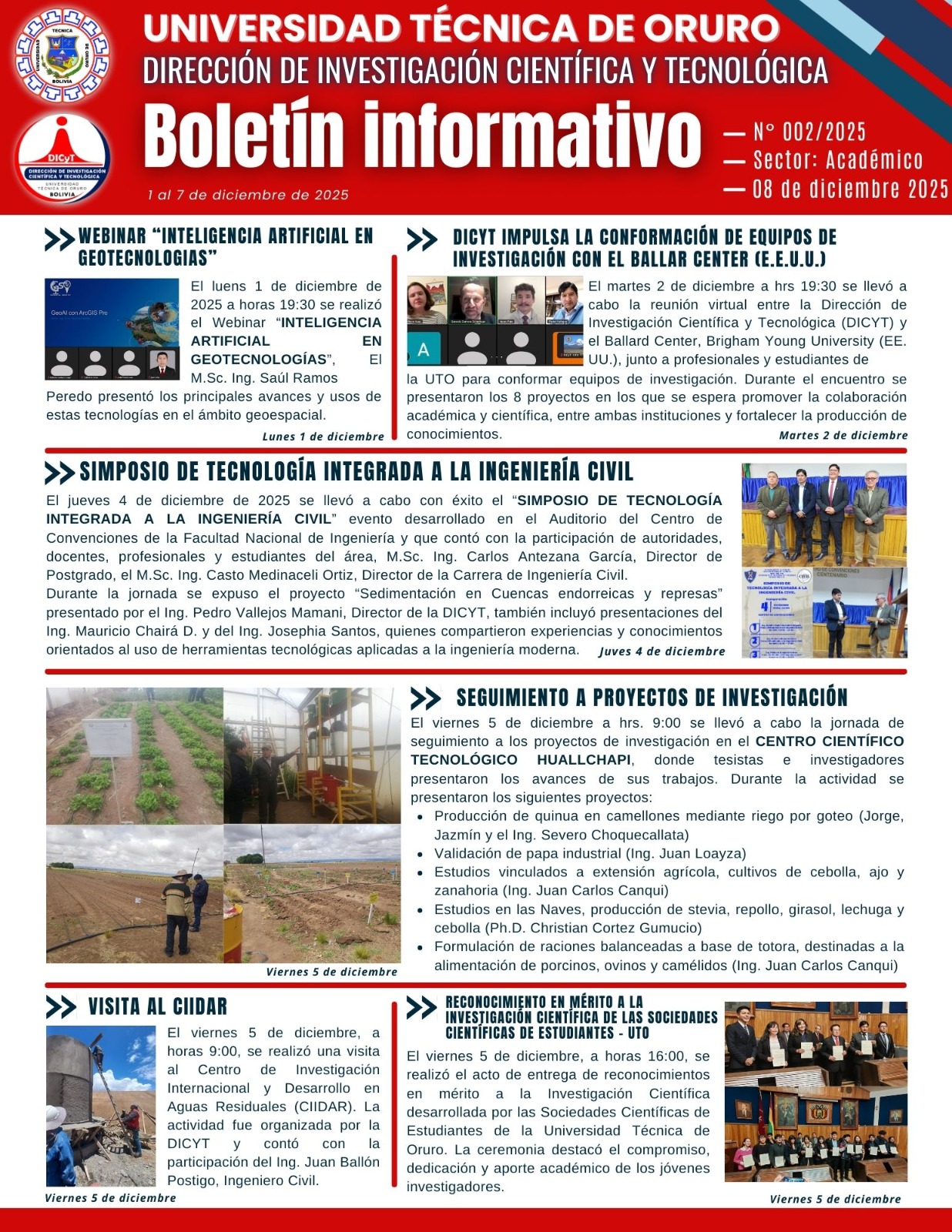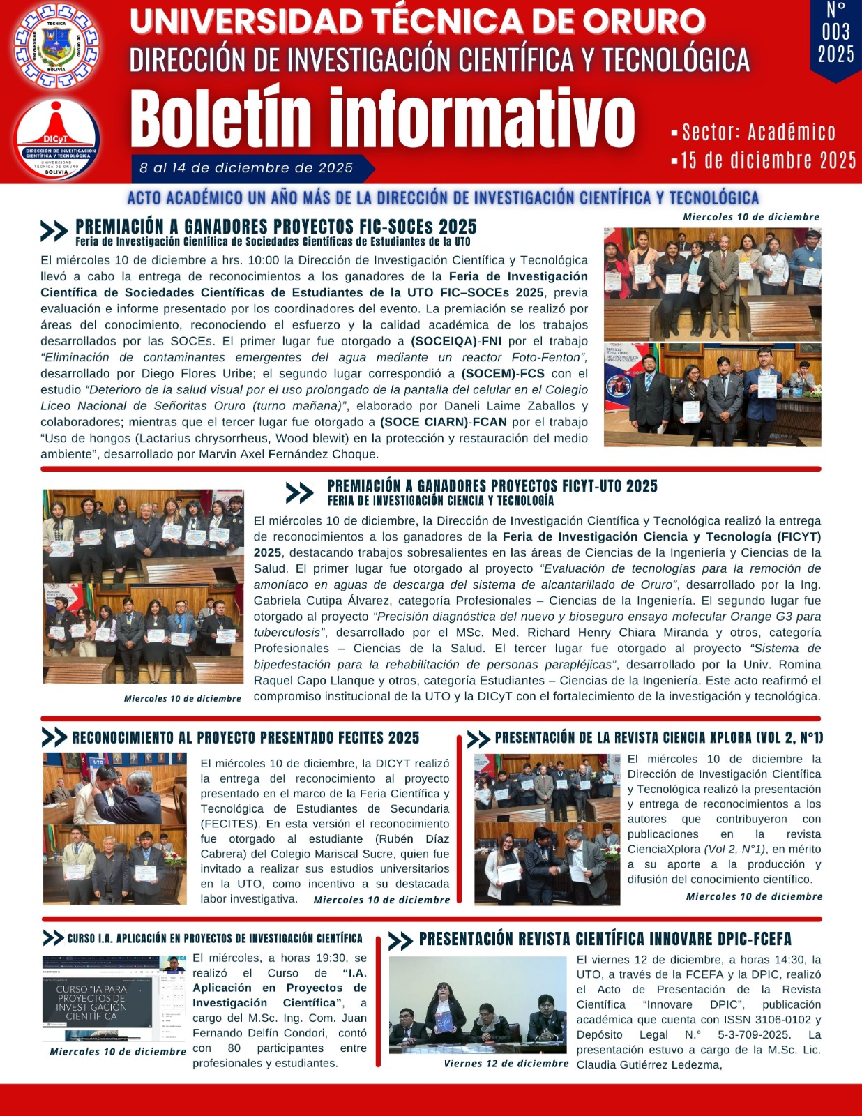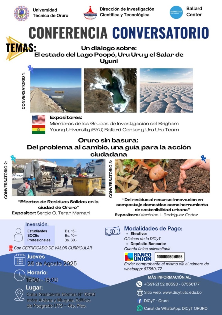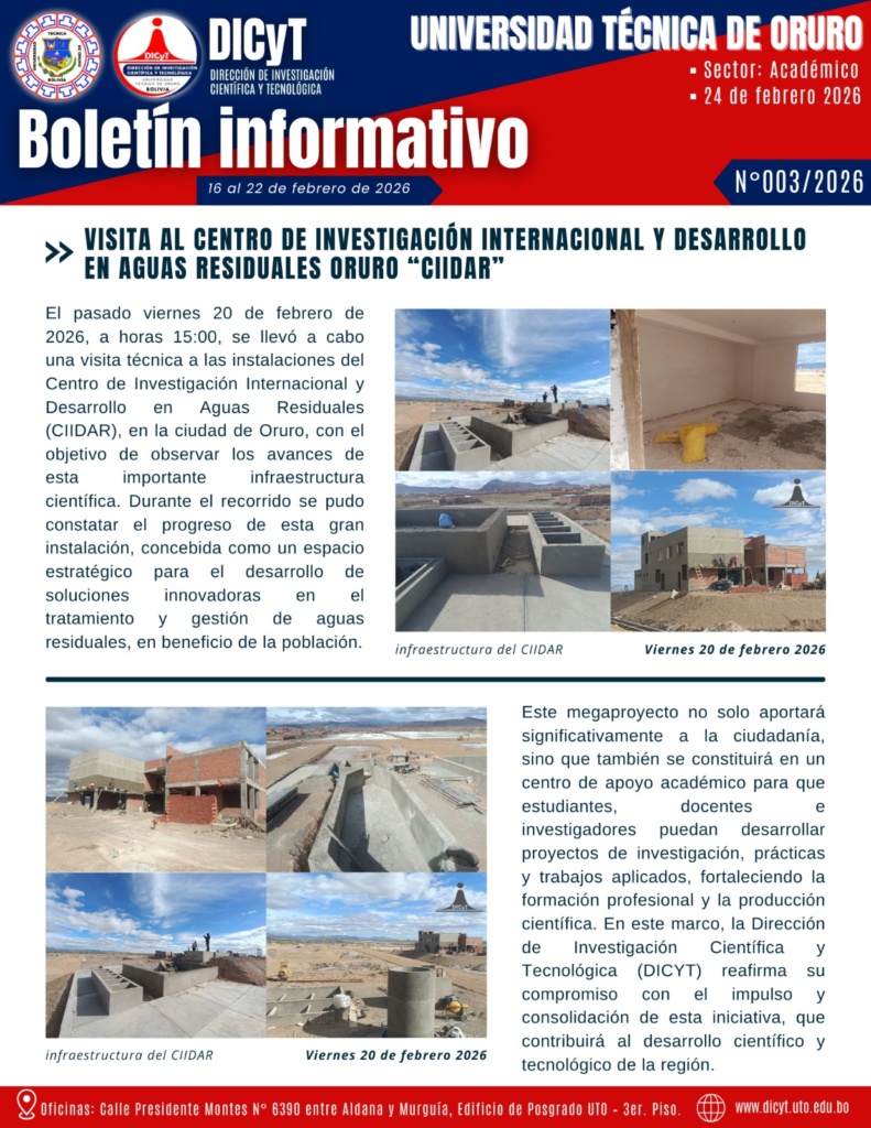 La DIRECCIÓN DE INVESTIGACIÓN CIENTÍFICA Y TECNOLÓGICA (DICYT) esta presente en la expoteco ORURO 2025, En nuestro stand número 47, ubicado en el Bloque Pariguana. Invitamos a toda la comunidad universitaria y al público en general a visitarnos, conocer más sobre nuestras líneas de investigación presentando información sobre el CIIDAR (CENTRO INTERNACIONAL DE INVESTIGACIÓN Y DESARROLLO EN AGUAS RESIDUALES), un proyecto emblemático que busca convertirse en un referente nacional e internacional en el tratamiento y saneamiento de aguas residuales que impulsa el desarrollo científico y tecnológico. Además, tenemos juegos, material informativo y premios, promoviendo así la ciencia y el conocimiento.